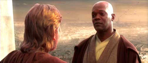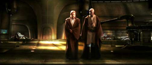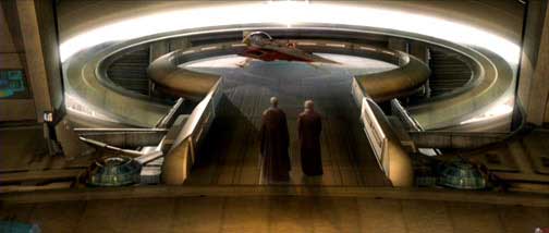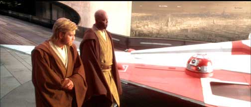 In this cut scene, Obi-Wan and Mace Windu speak alongside Obi-Wan's Jedi Starfighter. Obi-Wan shares his concerns about Anakin taking on his first mission and his emotional attachment to Padme. Although this scene was cut, it still exists in the movie, just in a different form. The final movie version takes place in a hallway in the Jedi Temple with Yoda taking part in the conversation from a floating platform.