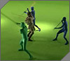 The BODYGUARDS raise their power staffs to knock OBI-WAN away, but OBI-WAN ducks as the deadly staffs whistle over his head.