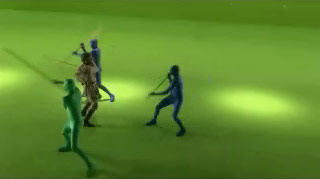 The Jedi's lightsaber ignites, and OBI-WAN deftly cuts one BODYGUARD in two. His staff flies into the air and is caught by GENERAL GRIEVOUS.