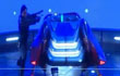 BAIL blasts the Clones. The Speeder takes off with BAIL clinging to the side. The CLONES fire at it as it disappears into the cityscape.