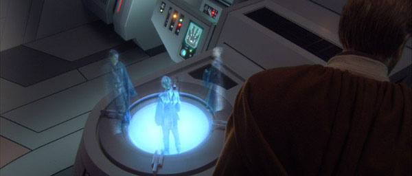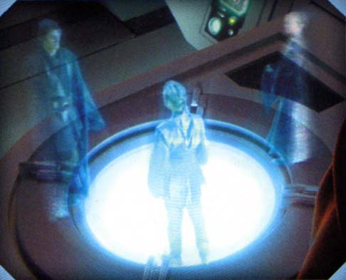 Lastly, is the security holocam recordings Obi-Wan and Yoda watch. The hologram flashes by extremly fast in the movie but many of printed reference materials feature shots with closer angles of the hologram that were omitted from the final film. There was also an extra bit of dialogue between Sidious and Vader that was excised as well.