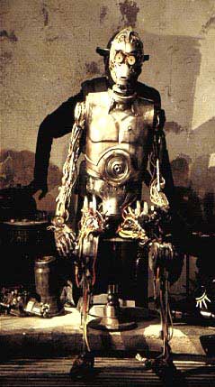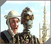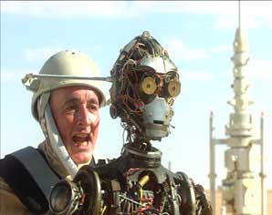 A: Threepio would have been in stitches too if this was real life. Which of course it is. But you are quite right. We originally shot Threepio as a puppet (see Gallery 1 for proof). Then there was a rather sweet scene at the Homestead where Padme can't sleep and of course, Threepio doesn't. He explains his sadness; that Anakin didn't have time to finish his project, before being whisked away, after an attack of the medicloreans to be a Jedi. Protocol generally frowns on public nudity, even on the giant beach that is Tatooine. The ever-thoughtful Padme finds a sartorial solution and Threepio is thrilled. All this and more. However, once the scenes had been cut and processed by ILM, to the point of perfection (especially the acting), Mr Lucas realised that this was not the moment to spend so long away from Anakin making sand-people-sushi. So we had to go back and fix all the previous scenes using the fully dressed, if rusty, droid. The inference is that it was Shmi who completed her son's handiwork. Just one more reason to buy the DVD when it arrives at a store near you.