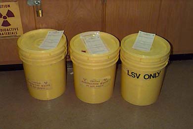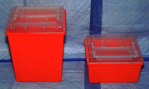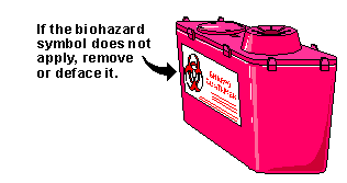 Sharp objects and objects that could easily puncture a plastic bag must be placed in a "sharps" container for disposal. This is to prevent a spread of radioactive contamination from a torn bag and also to prevent injury to the waste handler when processing the bag. |