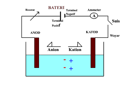 Sel Elektrolisis Sebaik sahaja arus elektrik(arus terus) dialirkan melalui elektrolit, ion-ion akan terurai dan bergerak ke masing-masing anod dan katod. Penguraian elektrolit oleh arus elektrik. |