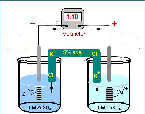 | Sel Kimia Sel kimia ialah sel yang menghasilkan tenaga elektrik melalui tindakbalas kimia. Sel kimia dibina daripada dua logam (elektrod) yang berlainan dicelupkan kedalam suatu larutan masing- masing elektrolit. Elektrod Zn dicelupkan ke dalam larutan ZnSO4, Elektrod Cu dicelupkan ke dalam larutan CuSO4 dan dihubungkan oleh satu jambatan garam. Arus yang terhasil ialah sebanyak 1.10A. |