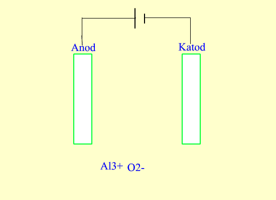 Ion-ion Al3+ dan O2- dibebaskan apabila aluminium oksida dileburkan. Ion Al3+ tertarik ke katod dan ion O2- tertarik ke anod semasa elektrolisis. Pemerhatian: 2O2- ------> O2 + 4e