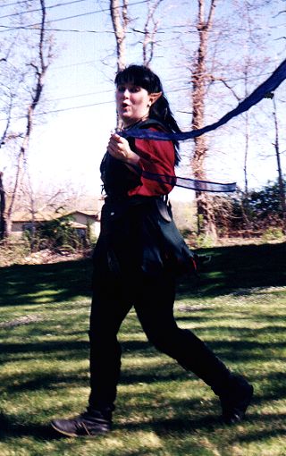 The Cait Sidhe Luna Llewellyn manuvers her ribbon over the head of the Cait Sidhe Deczin M'Cavity. |