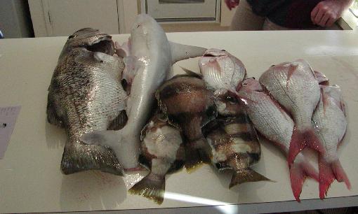 And here's our catch. From left to right...Dhufish, Thickskin Shark, 3 Knife Jaws and 4 Pink Snappers. If one fillet from the Dhufish was enough to feed three adults then just imagine what all of that could feed. Our freezer just couldn't handle all of it so that's why the neighbors ended up happy. |