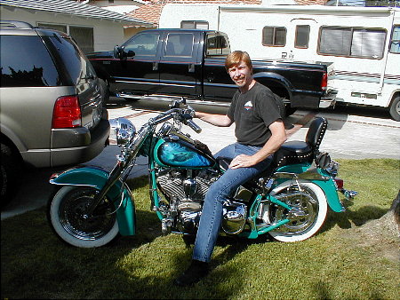 | Above is Lance Green (brother-n-law) and his ground-up Harley he built. Lance is one of those that is very talented at turning nothing into something and when I first saw this thing in it's original faded and rusted condition I knew it was only a matter of time and money that Lance would turn it into a beauty. I asked him if he'd be willing to sell it and he said (as I would also), No Way! He and his wife Sharon enjoy riding with their friends on various weekend runs. |
