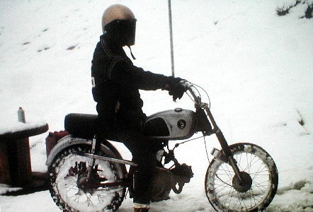 | Above is Mark on his passed down 1968 Honda 90 Sport freezing.. This was my first motorcycle that dad brought home in just about new condition. I think I was 13 or 14 when I started riding this thing. It was actually a great bike and very reliable. I learned all the basics (wheelies, power slides etc) with this little bike and Mark continued to ride it for some time. From this I graduated to a 305 Honda twin of which the pic's are forever lost. |