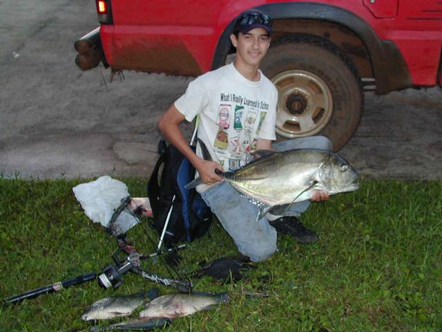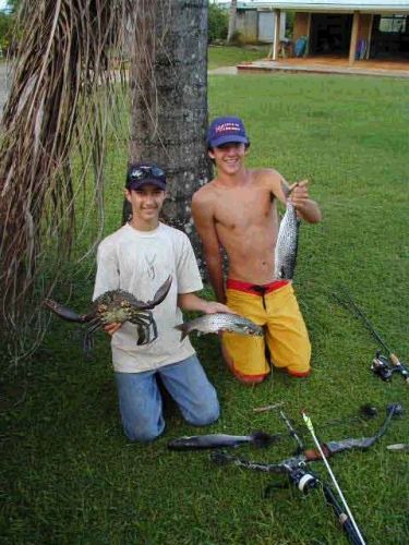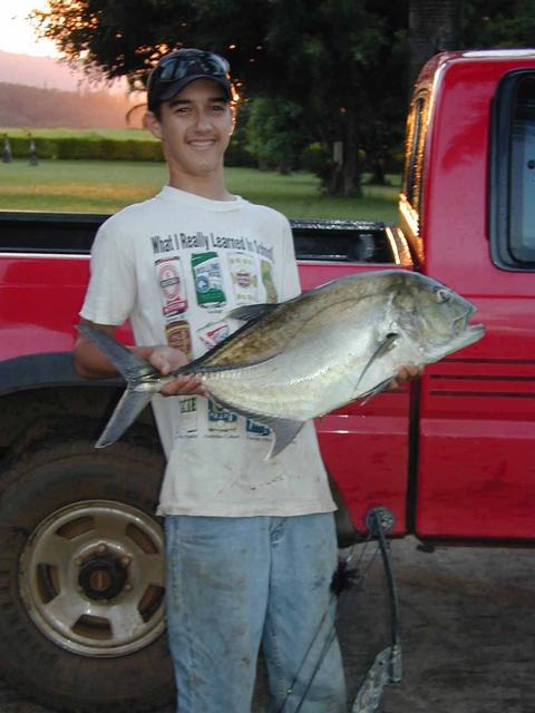 | We went back and I shot more crabs mullet and a couple huge tilapia. Evan hit another big ulua which tore out a bunch of line before coming off, just like the other. I hadn't had a shot at an ulua yet until this one swam into range. I flew an arrow at it and somehow, by luck, hit it dead in the brain stoning the fish. It simply roled onto it's side without giving so much as a kick. Good thing too because the arrow never even penetrated onto the barbs. There is a samoan crab next to my knee in the left picture. |