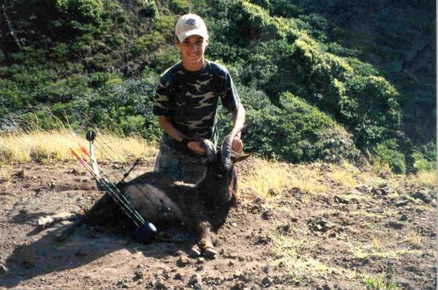 | Hanakoa Valley 90 lbs 14 inch horns First shot was a gut shot, second was double lung but it fell off a 50 ft. cliff landing in a sciso tree. |