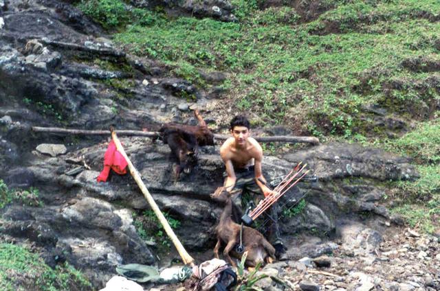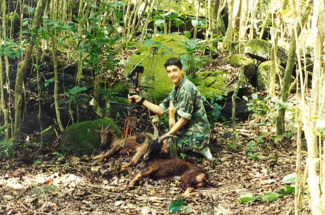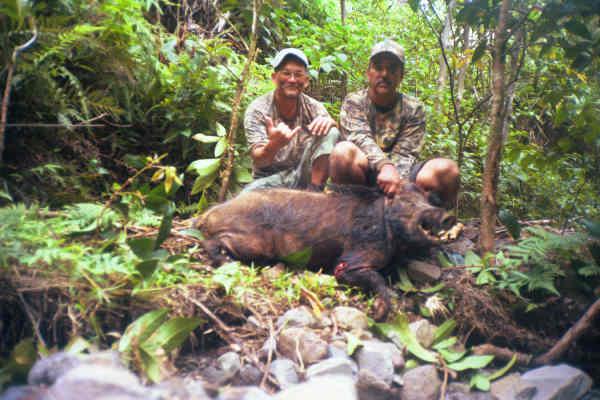 | My friends Van Chun and Ernie Gonsalves (right) were hunting Hanakapiai Valley when Ernie arrowed this huge ugly boar with his recurve. Weighed around 200 pounds. | ||||||||||||||||||||||||||||||||||||||||