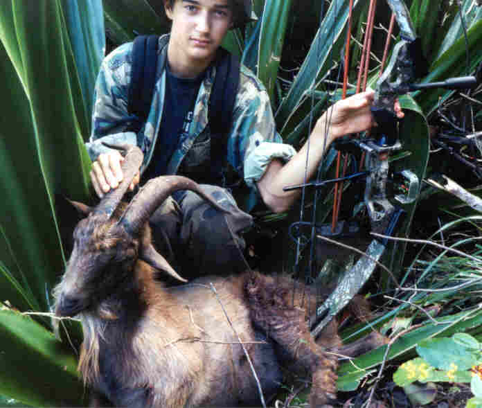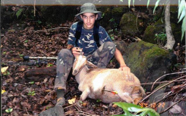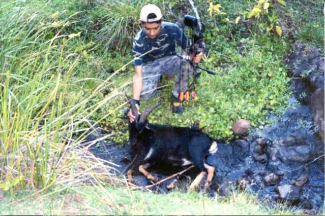 | Nice sized little billy from the watercress valley in Napali. 15 foot shot. He ran across the stream, onto the slope on the other side, and then roled back down landing in the stream. About 60 lbs. This was the third goat I ever got when I started hunting back in 2000. |