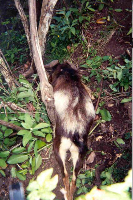 | He left a good blood trail and rolled down into one of the valleys before stopping on some trees. I packed him out to the ridge for pictures. Horns measured 16 1/2 inches tip-to-tip and had a nice downward curl.. This is what I call an up-land goat. They live high up on the hills, have a more multi colored coat, and the horns curl down similar to that of a ram rather than the typical "up and out" curl of the spannish goat. Some are silver/blue in color. This one weighted around 80 pounds. |