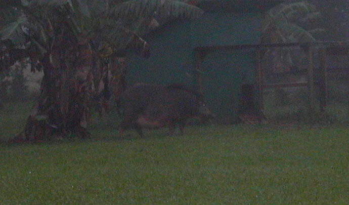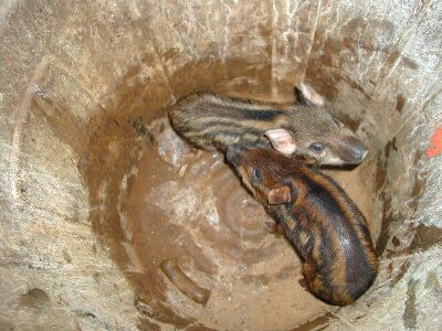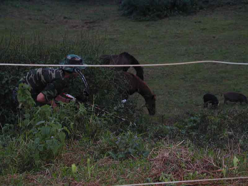 | Evan Stalking two pigs (above left). A black boar and another grey pig, about 80-pounds each. We got the black pig (above right) but the other got away. Then a couple months later, durring a rainstorm, (below left) evan takes a picture of a fatty sow in his yard. She looks huge but is probably just 100 pounds. He doesn't go for her because she is pregnant. Then a couple weeks later, Evan catches these piglets in his yard (below right). They were released and caught again a week later. | ||||||||||||||||||||||||||||||