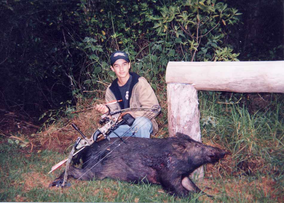 | Evan Bouret with an 80-pound Boar right next to his house. | ||||||||||||||||||||||||||||||