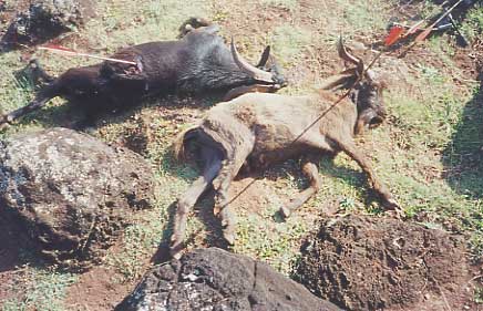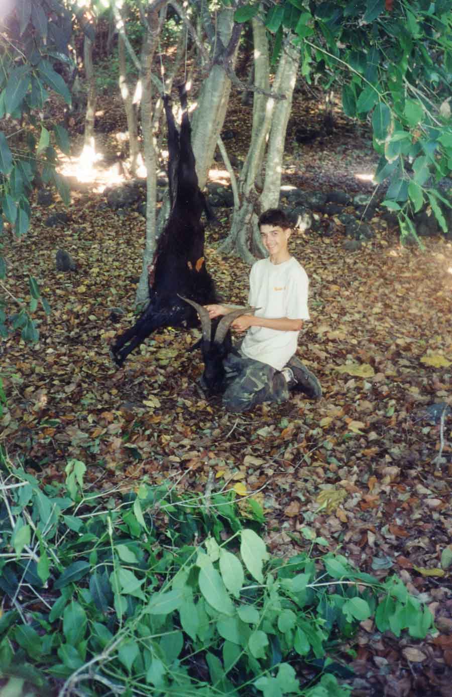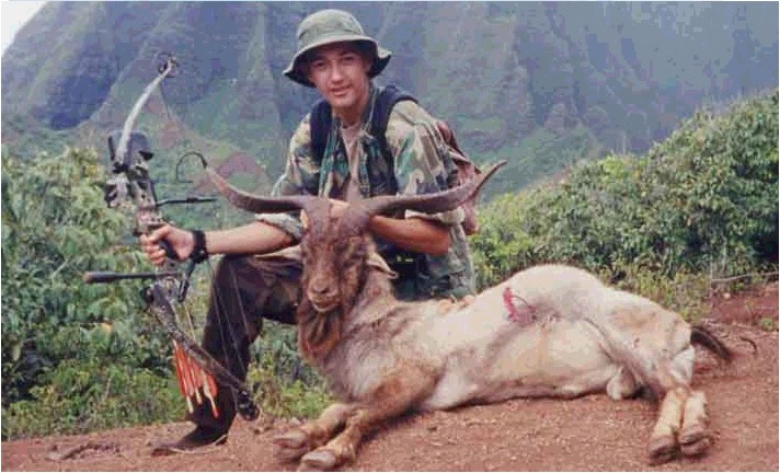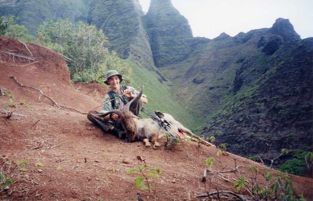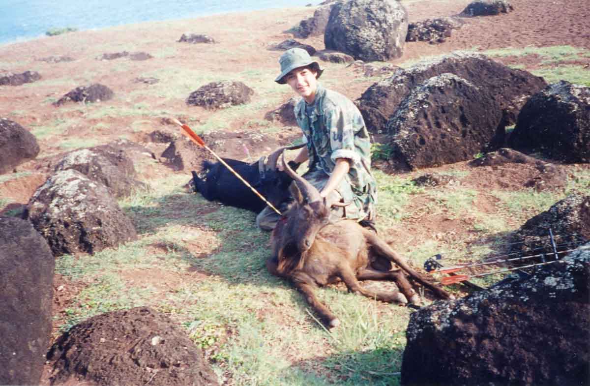 | On the morning of the second day, I went over to the Mahiki flats. Goats everywhere. I Made a 25 yard shot at a good sized billy which jumped the string but the arrow still hit in a way that it angled forward into the lungs. The second goat was 15 yards away and I hit way too far forward but spined him. Spent the next day smoking meat. | |||||||||||||||||||||||||||||||