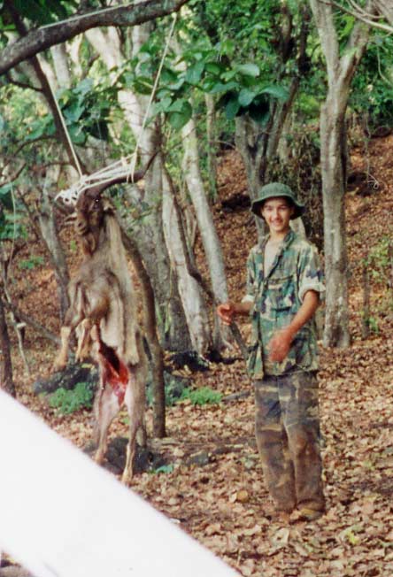 | First day, we took a boat in early in the moring. Goats everywhere. I planned not to shoot anything the first day but with so many goats everywhere, I couldn't stand it any longer, so I climbed up into the valleys above the beach and eventually got a huge 18 inch billy weighing over 100 pounds. | |||||||||||||||||||||||||||||||