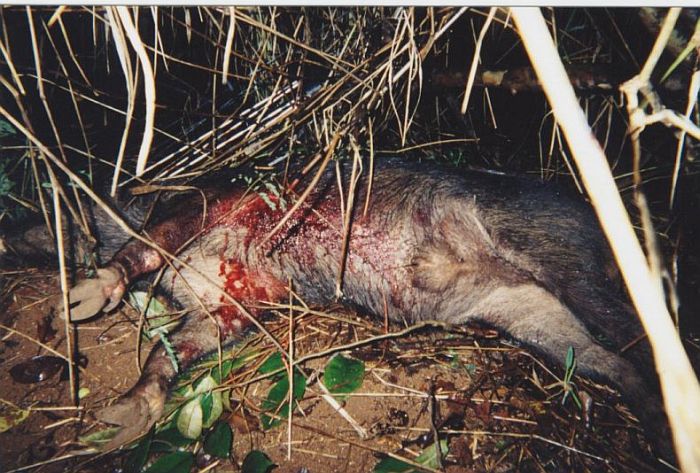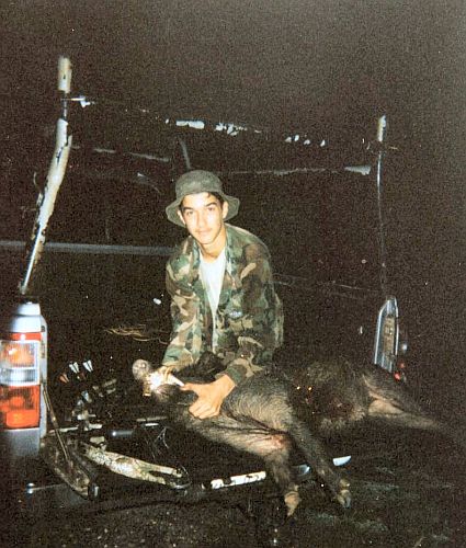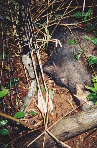 | August 13 was a rainy day but because pigs are often out walking around in the rain, I figured I would give it a try. My friends had just ran dogs thrue the same area the day before with plenty of action but no solid grabs. I was worried they had scared the pigs out of the area but as it turned out, they were still there. I emediately found fresh tracks in the dirt. Any old foot prints were washed away. I took the path down from my friend's property, across the stream and up the wall of the valley to the dried up ditch line. It was at the end of the ditch where it met the hau bush and bamboo where I ran into the pig. I was climbing the muddy steep side of the ditch, going up the wall when I looked up just in time to see a pig coming out of the bushes 20 yards away. It turned and walked right towards me. Kicking my foot into the side of the hill to keep me from slipping as I nocked an arrow. I was pretty close to the top of the hill already; it went flat at about waist height but the side I was standing on was still real steep and muddy too. It was an awkward position. The boar walked right towards me and passed behind a lantana bush giving me the chance to draw my bow back but instead of coming out, he stopped and started bouncing up and down on a small tree to scratch himself. I undrew my bow and waited posed ready to draw until he finally continued his walk. I drew back again and as he came into a somewhat clearer shooting lane, I whisled to get him to stop. He was now 20 feet away and had an angry "What the F was that" look on his face. I aimed and let one fly hitting really low and behind the armpit. I saw a spirt of blood so I knew I had a good hit and the pig ran off in the other direction without seeing me. Good thing too because he was acting like he would have charged. I didn't know how big he was at the time. I though he might be 100 pounds or more and saw the big tusks but didn't expenct him to be as big as he was. For the next hour I kept hunting before taking up the trail as it was getting dark. The rain had partially washed away the blood trail but after crawling thru tunnels with my flashlight I found him not 35 yards away. Hit him right in the heart. I went back and got Oli to help and we dragged it out to a truck. The tusks measured a little over 2 1/2 inch long and were of good thickness. It is still the best pig I have got with my bow second best overall. |