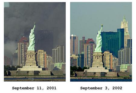 Lights from the former World Trade Center site can be seen on both sides of the Statue of Liberty from Bayone, N.J., Thursday, Sept. 11, 2003. | ||