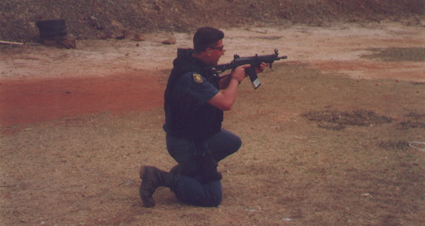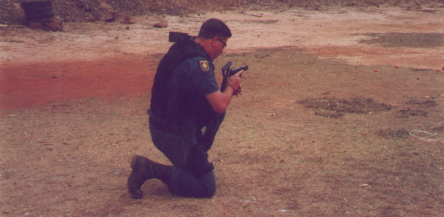 Finishing off a "Groucho-walk" box-drill on the range with the R-5 on fully-automatic (running to empty) on the Handgun, Shotgun and Tactical/Assault Rifle Instructor's Course through ITA (International Training Academy - also certified by the University of South Africa (UNISA)). Going to kneeling to minimise size as a target...