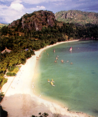 White coral sand beach, calm turquoise waves, superior resorts facilities. Swimming pool, tennis courts, aquamarine sports. Sunset cove live seafood restaurant, seaside bar and more