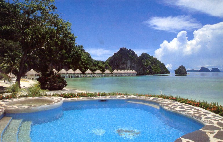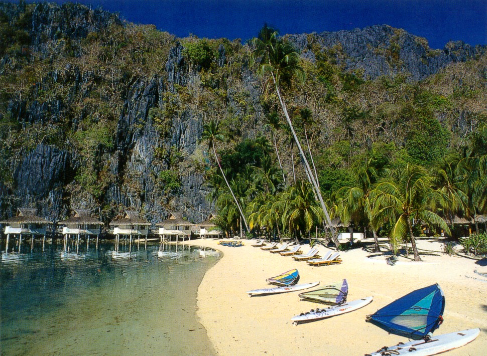 Situated on a 220-acre private island 200 kms east of Northern Palawan. 40 luxurious air-conditioned casitas, 29 beach side, 7 hill side and 4 tree top, each with spacious bath area and private terrace. Personal carts provided for each casita. Restaurant, bar, Beach club, picnic grove. 24H room service, massage service, tennis court, swimming pool, marine sport facilities, dice center, boutique library and art gallery.