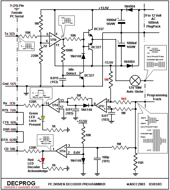 While most Command Stations on the market can program decoders I don't like the idea of having to interrupt railway operation in order to program or reprogram a DCC decoder. This would be particularly annoying if somebody arrived in the middle of an operating session only to find they have an address clash.With a seperate programmer any maintenance can be done away from the layout at leisure. I also find the software that is available free of charge for this programmer is far easier to use than a sequence of button combinations on a command station.This circuit has two main differences when compared to Wayne Rodericks pioneering effort. First it has its own dual rail power supply. For the small extra cost the circuit will work with all PC's including those with 0-5 Volt "almost" RS 232 serial ports. It will also not load a serial port unduly with the associated risk. The second difference is it's all done with one chip, a quad FET Operational Amplifier, allowing easy construction. This is a beginners Veroboard project. Idle detection is provided to shut down the output when no signal is being sent from the PC. This prevents decoders that have DC mode activated from driving their loco off the end of the programming track!
