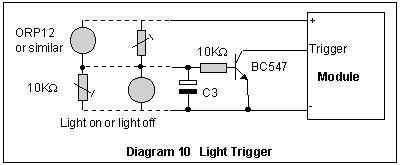 In diagram 10 a photocell is used to turn a transistor on when interrupted. The transistor (just about any NPN type) triggers the sound module. A control over light sensitivity is provided and the trigger can be extended using the capacitor. Swap the sensitivity adjustment pot with the photocell to reverse the activation from light off to light on.
