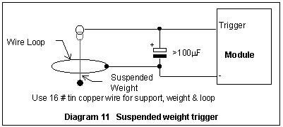 shows how a suspended weight can be used to trigger the module. The capacitor keeps the module triggered if the weight touches the loop for less than the sample period, adjust it to suit. This circuit has been used to make the cattle complain when the truck rocks!