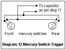A mercury switch adjusted to the right angle as per diagram 12 can be used to trigger a crunch sound when a piece of rolling stock couples. The best way to make the switches adjustable is to solder them to 16# wire that can be bent to a suitable angle. With two switches the circuit will trigger in either direction.