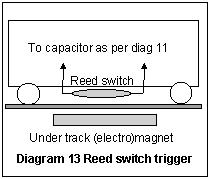 A reed switch is about the simplest way a sound can be triggered on a moving train that runs on conventional DC or pulse controller. The circuit in diagram 13 shows you how to do this. The circuit triggers every time the carriage passes over the magnet, the length of which is a factor in the play time. An electromagnet will only trigger when switched on.