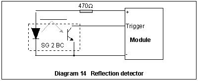 Reflection detectors are ideal for "chuff" generators. The inside of a loco driving wheel is segmented into four with black paint. The segments are painted silver if the wheels are not reflective enough and the reflection detector is mounted under the chassis. Refer to diagram 14.