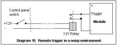 The trigger wires can be extended to a control panel. If a noisy environment causes false triggering use a relay to isolate the module.