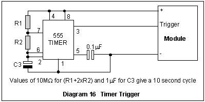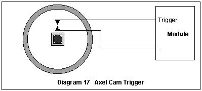 A square cam on a driver axle, or two "bumps" on a pony or tender axel of approximately half the drivers diameter, can trigger the module for use as a chuffer. One "bump" can give a tram a flat wheel! See diagram 17.