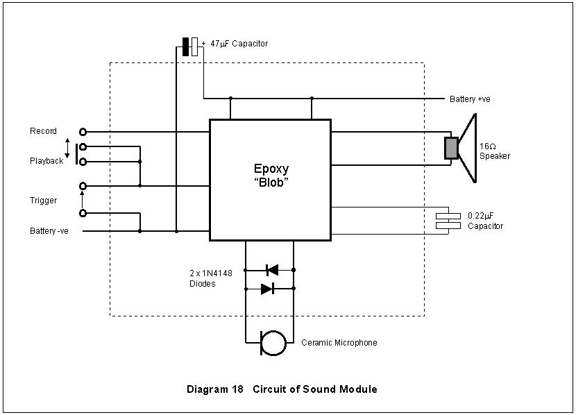 The diodes D1 & D2 are also only used for recording. If you have first class soldering skills it is possible to reduce the board size to being not much larger than the black epoxy "blob". First draw a diagram of both side of the board showing connections and copper track layout. Pay attention to +6Volts, -Ground, 2 speaker wires and the trigger wire. Scrape the green solder resist off these tracks that require connection for playback as close as possible to the blob and reconnect them and test the board. If you have not destroyed the module so far carefully trim the module down to the smallest size possible that allows the connections to remain.