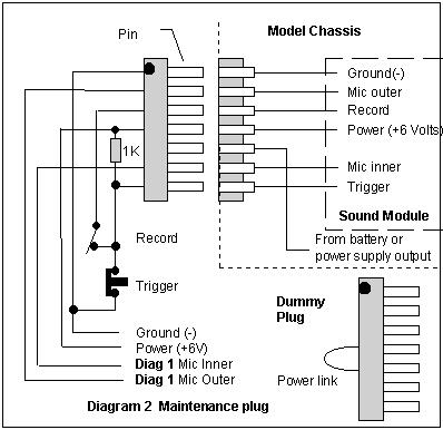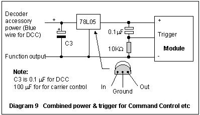 Command control decoders having function/accessory outputs can normally be directly connected to the sound modules. Check with your supplier that the outputs are "active low". The current drawn by the module is well under 100mA and should not effect the decoder. The combined power and trigger circuit shown in diagram 9. The components can be easily fitted to the existing circuit board. Solder in order - 10K resistor, 0.1 capacitor, the voltage regulator with its input free and C3 between "-" and this free end.