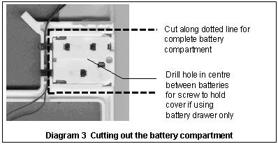 The battery pack can be carefully cut from the shipping module as shown in diagram 3 to create a separate battery pack. Alternatively the battery pack can be unplugged from the shipping module and a lid screwed over the batteries, this will allow it to fit in most HO scale rolling stock widths.