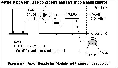 Power supply for pulse controllers and carrier command controlA pulse controller normally has a narrow pulse of full DC voltage even when a loco is stationary. Carrier command control normally has a full DC voltage on the track at all times. Increasing C3 to 100m F in diagram 4 will provide a power supply for these types of control.