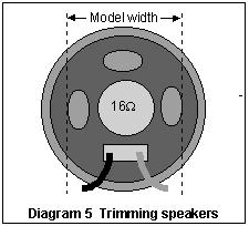 Speakers can be carefully trimmed with a sharp blade as shown in diagram 5. Provided the cut edges are not touching anything the sound is still quite reasonable. If you do find that a resonant note has been created try using a graphic equaliser to notch out the offending frequency.