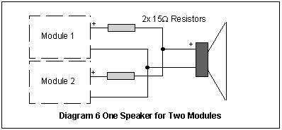 Two sound modules can be used with one speaker in a constricted area as shown below. The resistors isolate the speaker outputs of each module so that they are not destroyed by each other.