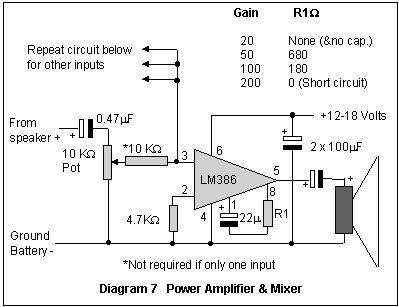 Several modules outputs may be mixed and their levels individually set using the mixer circuit shown added to the amplifier in diagram 7. The circuit is repeated for each input connected to pin 3 of the LM386.