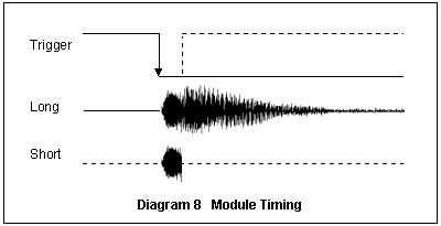 The timing diagram below shows how the voltage applied to the trigger lead controls recording and playback. The unit is triggered on a transition from full voltage to no voltage (ground) and the sound continues to play as long as the trigger remains grounded. Removing the trigger stops the sound as shown by the dotted line. This can be useful with, for example, short and long whistles. As shipped the module is triggered when the white button is released and allows the whole sample to play.