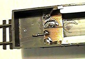Under the wagon a solid contact is provided using a gold wire wrap pin bent across the chassis rails just behind the Kadee coupler. The pin is brought through the wagon floor and soldered to one side of the PCB. Another hole passes through the other half of the PCB. A piece of guitar string is soldered onto the PCB. This spring steel wire protrudes through the floor where it is bet to fit under but just not touching the axle. It is again bent so it nearly touches the fixed pin across the chassis bottom.