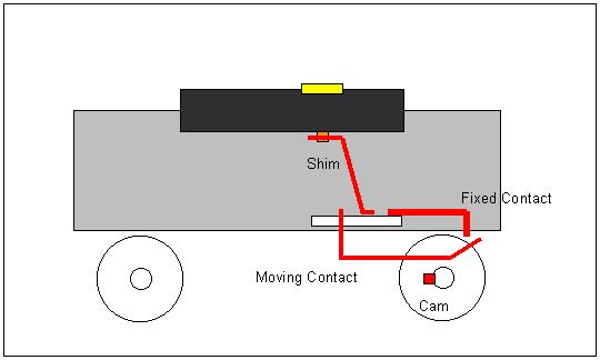 The original bike speedo used a magnet and reed switch to provide the distance pulses. While this has been successfully used (and documented) by others with applications from miniature railways to garden railways the components are far to large for HO. In this case a simple light weight cam operated switch is quite satisfactory.