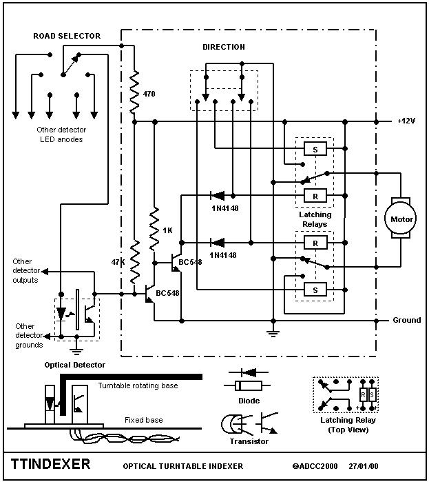 The road selector switch applies power to the LED in one detector at a time - the detector for the chosen road. When the turntable has rotated to that road the light will pass through the hacksawed slit and cause the output of the detector to be switched to ground. The BC548 transistors amplify this signal and use it to reset the latches via isolating diodes. These diodes allow the detector to reset both latches while the direction switch can only set one and reset the other.