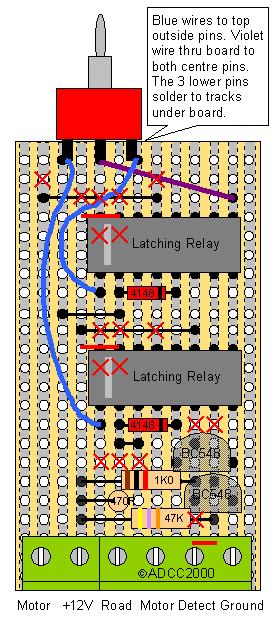 My original control circuit used flip flops to handle the set and resetting operations. On looking at this circuit after five years (a fellow modeller had made an enquiry) I started to do some "japanese engineering" and simplified the circuit further. Then it occurred to me that latching relays, more common and cheaper these days, could replace the flip flops and their driver transistors completely. The result is a circuit with minimal electronics - a beginners Veroboard project.
