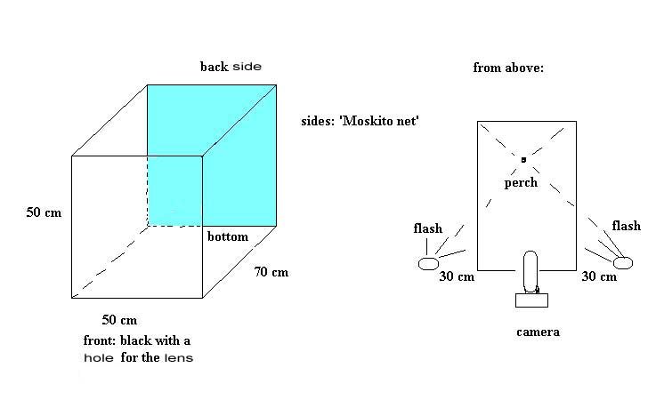photographs of Carduelians. All pictures were shot by Hans. He has a well proved method to make photos of birds. You will find a sketch of his method too. Please click on the thumbnails to enlarge the images. Use the back button of your browser to return to this page. Okay fanciers, enjoy these wonderful pictures of real gems of the bird world! 1,1 (Common Canary) Serinus canaria (L., 1758) Skins of Serinus canaria (L. , 1758), all females As Hans mentioned on the Canary List and the Allcanarybreeders List, there is a sexual dimorphism in wild canaries. Please pay attention on the buff feathering of the females. The tips of the feathers are not coloured, especially on the neck. 1,0 (Cape Canary) Serinus canicollis (Swainson, 1838) The Cape Canary is a close relative to the wild canary. The bird lives in the east and south of Africa and prefers a subtropical or tropical climate with some trees and bushes. Cape Canaries should be fed with a basic seed mix similar to the wild canary. It is possible to breed them in large cages. In German it is called "Graunackengirlitz" means "Grey Neck Serin", I think it is clear why they are named that way. 1,1 (Syrian Serin) Serinus syriacus (Bonaparte, 1850) The Syrian Serin is also called "Syrian Canary". The bird lives in Syria and neighbouring countries. Syrian canaries prefer more dry and open landscapes with singly trees and bushes. Please pay attention on the sexual dimorphism. 1,0 (Black-headed Canary) Alario alario (L., 1758) The Black-headed Canary is also a bird with sexual dimorphism. The female hasn't that black-headed throat, she appears a little bit fader. They live in the south of Africa and prefer wide and open ranges with some dry bushes and grasslands. In captivity Black-headed Canary tends to get fat. So the fancier have to pay attention on the bird's diet. The best way to keep them in shape is to keep them in big flight cages or aviaries and to feed them with seed high on carbohydrates and low in fat. A good seed mix for African finches with added grass seeds and other small seeds should be fed. During the winter period they should be kept indoors. They also love young leafes of trees and some needles of coniferas. If not available, they should be fed with chicoree or brocolli. Soaked or sprouted seeds help to bring them in breeding condition. Black-headed Canaries are well breeders in captivity. And finally, Ladies and Gentlemen...... ...Hans' method to shoot such beautiful photos!