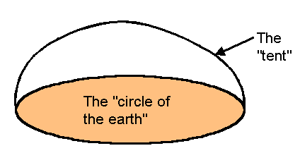 The presence of the word circle [b] here has led some over enthusiastic Christians to solicit this passage as proof that the Bible tells of a spherical earth. This however is not the case. True, a circle and a sphere are both "round", but the shapes are not interchangeable. A coin is an example of a circular object, flat but circular. A tennis ball is an example of a spherical object. The shapes are different. Note further the use of the word tent to describe the sky. A tent is something you put on a flat surface. There has never been a tent that is a spherical object enveloping another spherical object, as is the earth's atmosphere which forms the bluish sky or heavens. Figure 4.6 below shows what the author of Isaiah actually meant: [1]